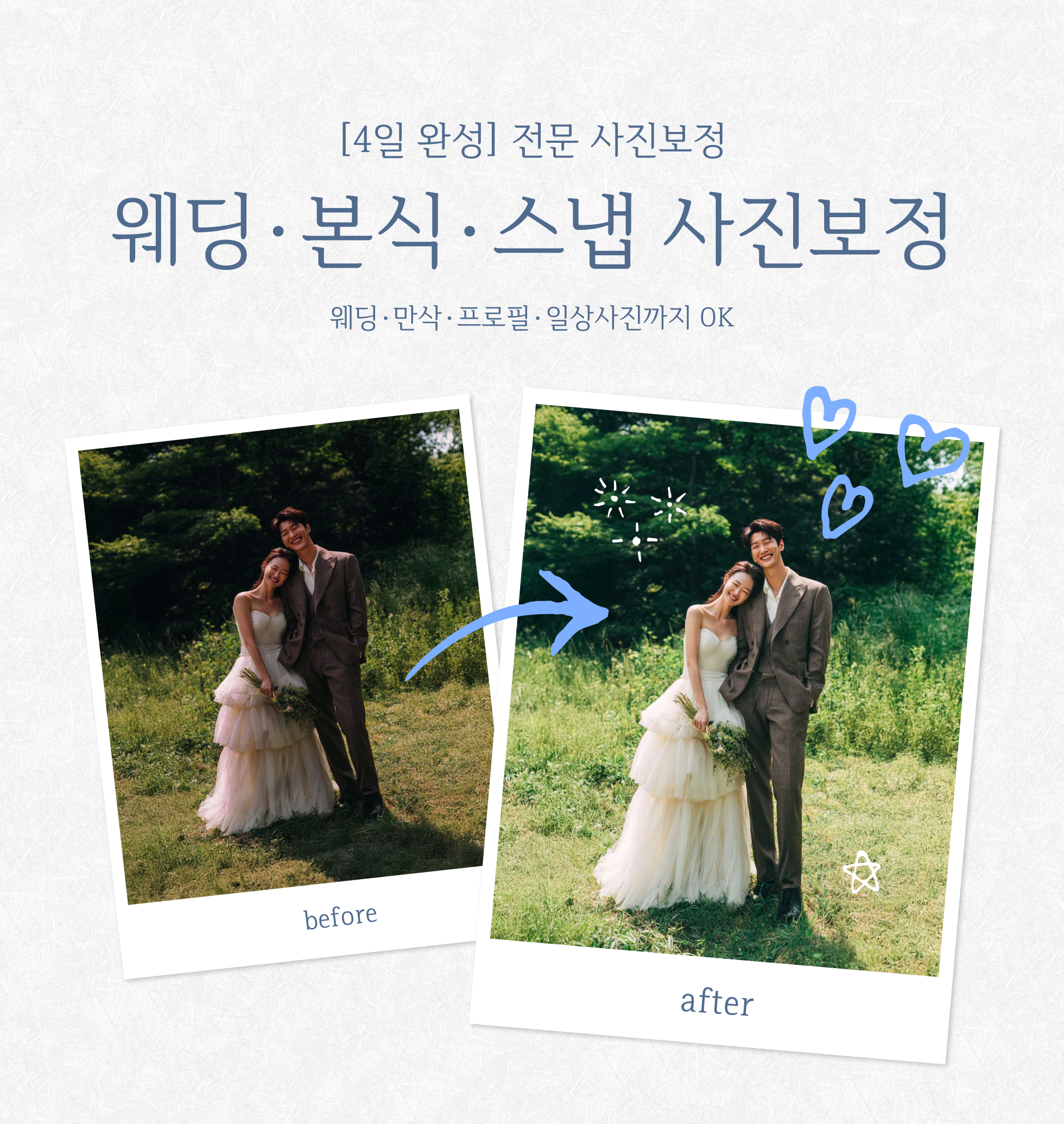 – 사진에 따라 가능 여부가 달라질 수 있으며, 담당 디자이너가 별도 안내드립니다.