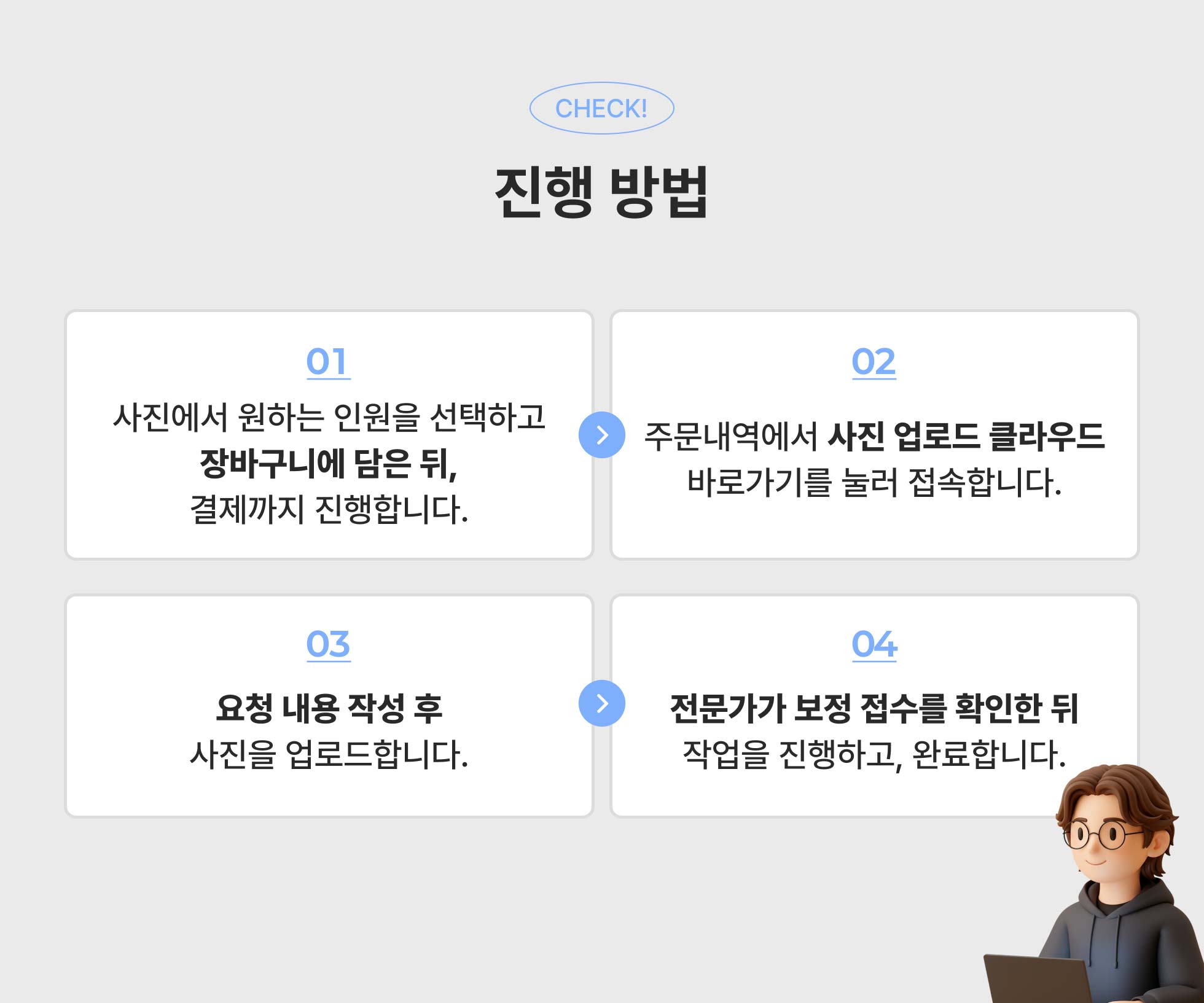 1. 사진 업로드는 결제 후 주문 완료 시 가능합니다. (주문 후 주문내역 > [사진업로드] 버튼을 이용해주세요.)