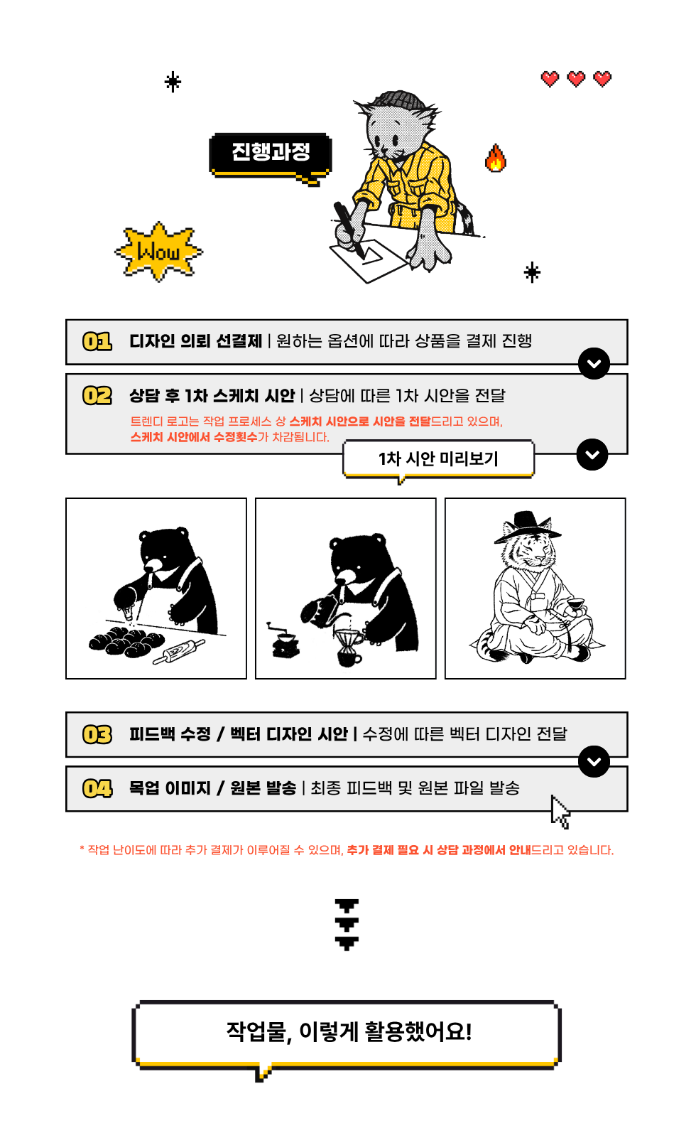 ② 디자인을 받은 후 전면적인 컨셉을 변경 요청할 경우 개당 추가 요금 40,000 ~ 이 부과되며 수정횟수에 포함되지 않습니다.