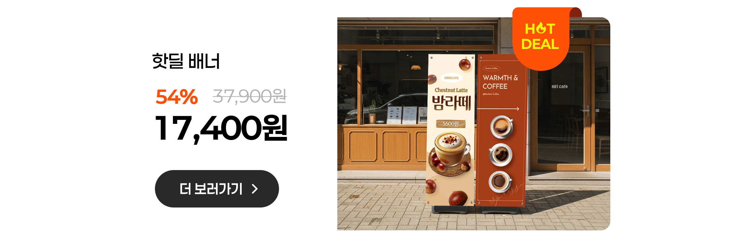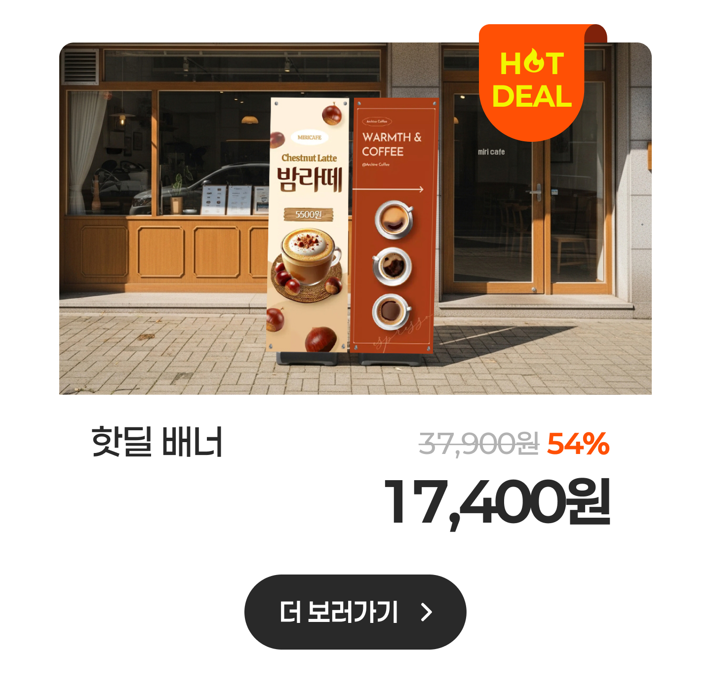 혜택/핫딜 겨울 매출 UP 매장에 필요한 홍보물 포장/배달 용품 혜택&핫딜 겨울매출 업 매장홍보물 포장&배달 쿠폰 모두 다운받기쿠폰 유효기간 : 2025년 11월 30일 만료 템플릿 더 보러가기 핫딜 배너 17,400원~ 반값 포스터 800원~ 스티커 1매 52원~ 현수막 14,900원~ 미니 배너 4,900원~ 자유사이즈 페트지 11,500원~ 교체용 배너 (거치대 미포함) 11,900원~ 보드형 포스터 8,500원~ 스탠드 POP 1개 505원~ 행잉배너 27,200원~ 대량 양면 전단지 1매 16원~ 핫딜 배너 17,400원~ 현수막 14,900원~ 반값 포스터 800원~ 교체용 배너 (거치대 미포함) 11,900원~ 자유사이즈 페트지 11,500원~ 와이드 배너 88,000원~ 워킹 배너 55,500원~ 핫딜 배너 1매 32원~ 대량 양면 전단지 1개 129원~ 현수막 1개 140원~ 미니 배너 1매 262원~ 반값 포스터 1개 426원~ 족자 현수막 12,000원~ 자유사이즈 페트지 1개 150원~ 와이드 배너 1매 68원~ 교체용 배너 (거치대 미포함) 1개 426원~ 윈도우 플래그 12,000원~ 차량용 자석 시트지 20,200원~ 슬림 물통 배너 52,400원~ 바닥 스티커 2,800원~ 개폐형 철제입간판 73,400원~ 아크릴 현판 20,800원~ 메탈 현판 27,400원~ 인테리어 스티커 8,580원~ 도장 9,100원~ 레터링 스티커 7,700원~ LED 배너(기본/물통) 234,600원~ 아크릴 스탠드 26,800원~ 베이직 쇼핑백 1장 375원~ 롤 스티커 1매 62원~ 등신대 79,500원~ [오늘출발] 배너 17,400원~ 양면 종이 포스터 862원~ 원형 행택 1매 42원~ 사각형 행택 1매 55원~ 통풍 배너 42,600원~ 자유 모양 POP 10,200원~ 판스티커 (원형) 1매 744원~ 프리미엄 투명 스티커 1매 21원~ 소량 고급 전단지 (양면) 1매 8.9원~ 단면 종이자석 전단지 1매 1.4원~ 보드형 메뉴판 36,990원~ 가로형 현수막 14,900원~ 더 오래 가는 현수막 14,000원~ 판스티커 (직사각형) 1매 744원~ 정전기 시트지 11,000원~ A형 자석 철제입간판 59,500원~ 액자 포스터 20,900원~ 싱글 자유 스티커 1매 20원~ 도장 쿠폰 1매 315원~ 고정 모양 POP 8,500원~ LED 조명 입간판 258,500원~ 프리미엄 블로그 체험단 272,000원~ 롤스티커 1,000매 62,700원 인쇄 종이컵 500개 80,000원~ 에어컵홀더 500개 74,300원~ 커피봉투 10장 31,500원~ W형 다용도 비닐봉투 100장 36,900원~ W형 포장용 비닐봉투 100장 44,600원~ 일반 무지 홀더 1000개 14,900원~ 크라프트 무지 2구 캐리어 200개 18,500원 실링페이퍼 500매 9,800원 12온스 무지종이컵 100개 9,900원 PET 107파이 32온스 아이스 600개 64,800원 PET 98파이 24온스 아이스 1,000개 60,800원