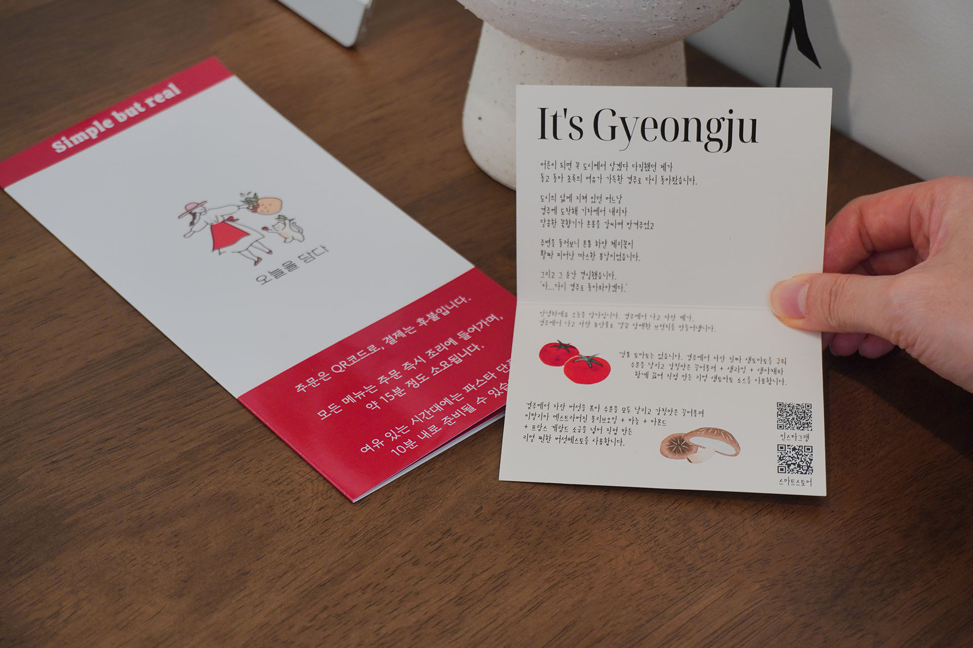 경주의 한 골목, 좋은 재료를 쓰는 자부심이 밖에서부터 느껴지는 식당이 있습니다. 홍보물에서부터 손님에 대해 깊이 고민한 흔적을 느낄 수 있는 이 곳. 편한 마음을 가지면 음식도 더 맛있고, 가게에도 애정을 갖게 되기 마련입니다.