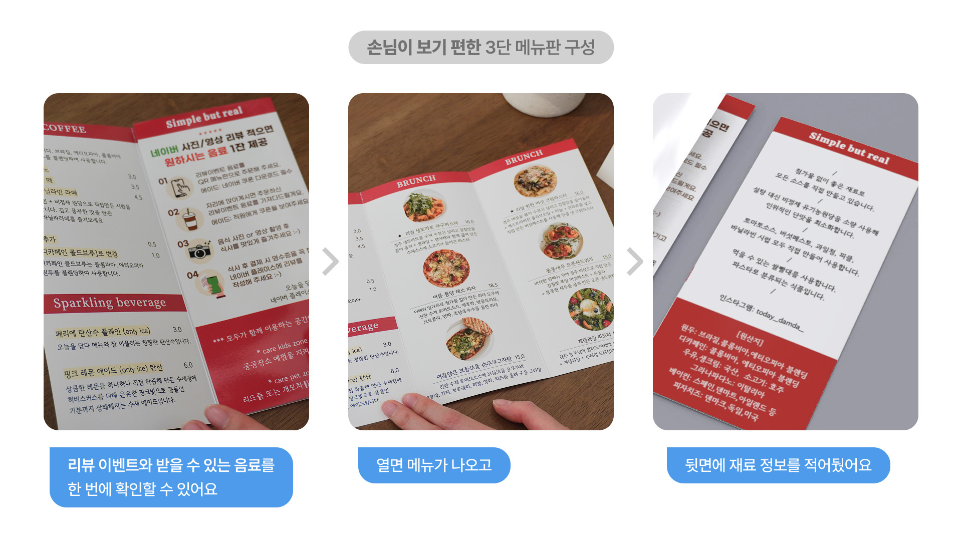 포스터로 붙여놓는 방법도 좋은데, 앉은 자리랑 멀면 참여하시기가 힘들어서 매장 테이블마다 둔 메뉴판에 방법을 적어뒀어요. 하고 싶은 말이 좀 많아서 3단으로 만들었어요.
