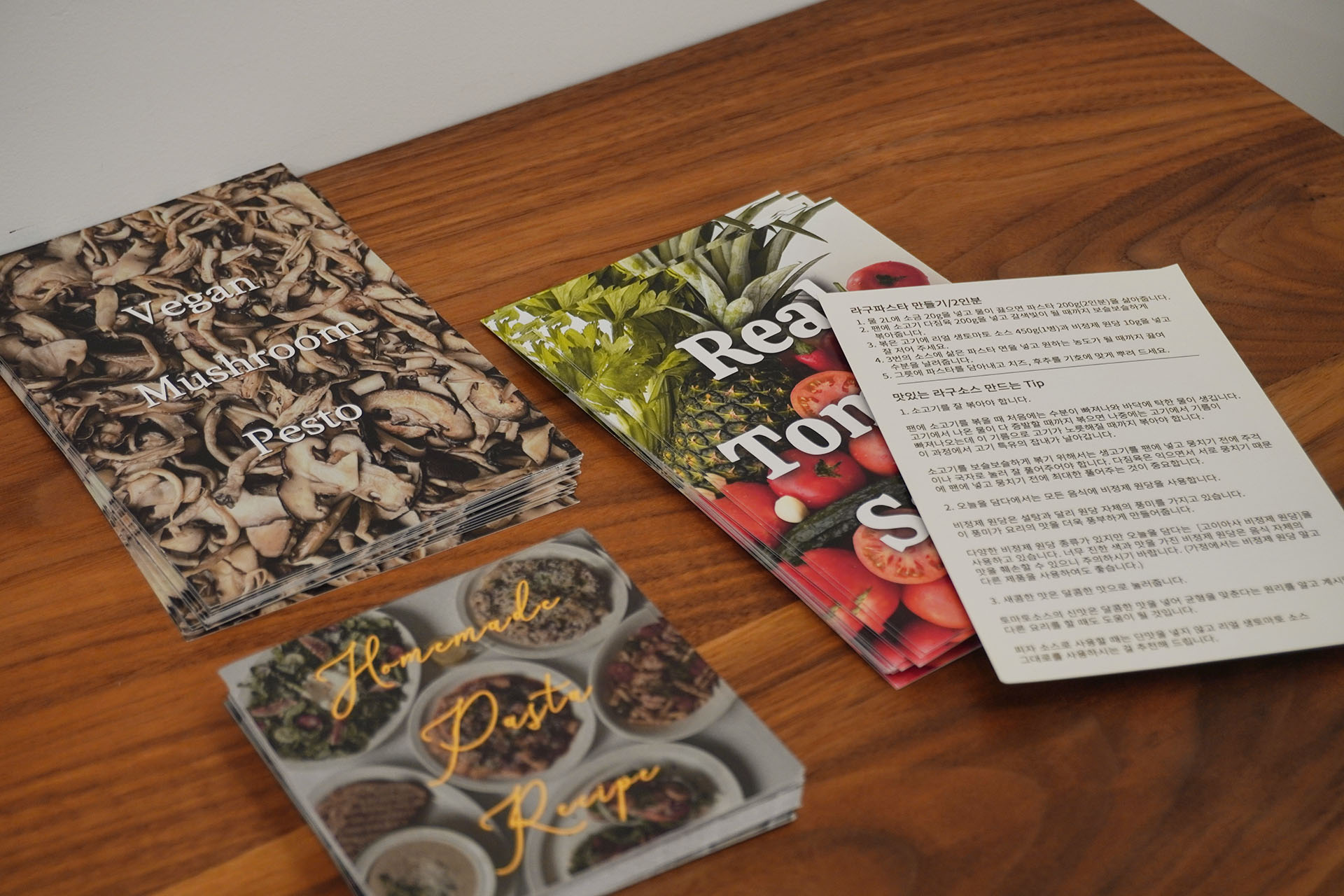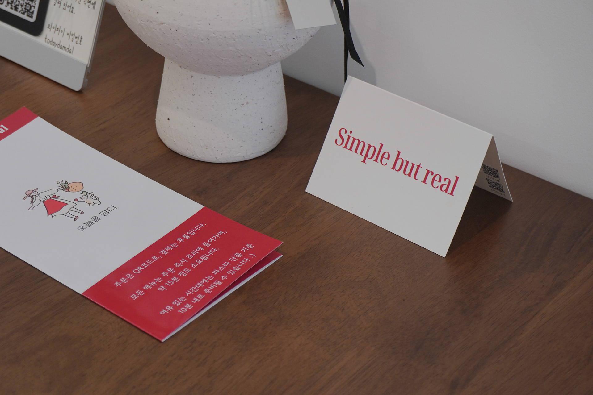 포스터도 좋지만 엽서를 잘 쓰고 있어요. 저희 매장의 시그니처가 토마토소스랑 버섯 페스토를 제가 다 직접 로컬 식재료를 사용해서 만들고 있다는 건데, 그 부분을 인스타그램이나 이런 데 아무리 올려도 모르시는 분들이 많아요. 또 메뉴 나오는 데 시간이 걸리니까 그 시간 동안 보면서 매장에 대해서도 알게 되고, 기다리는 시간도 지루하지 않도록 준비했어요.