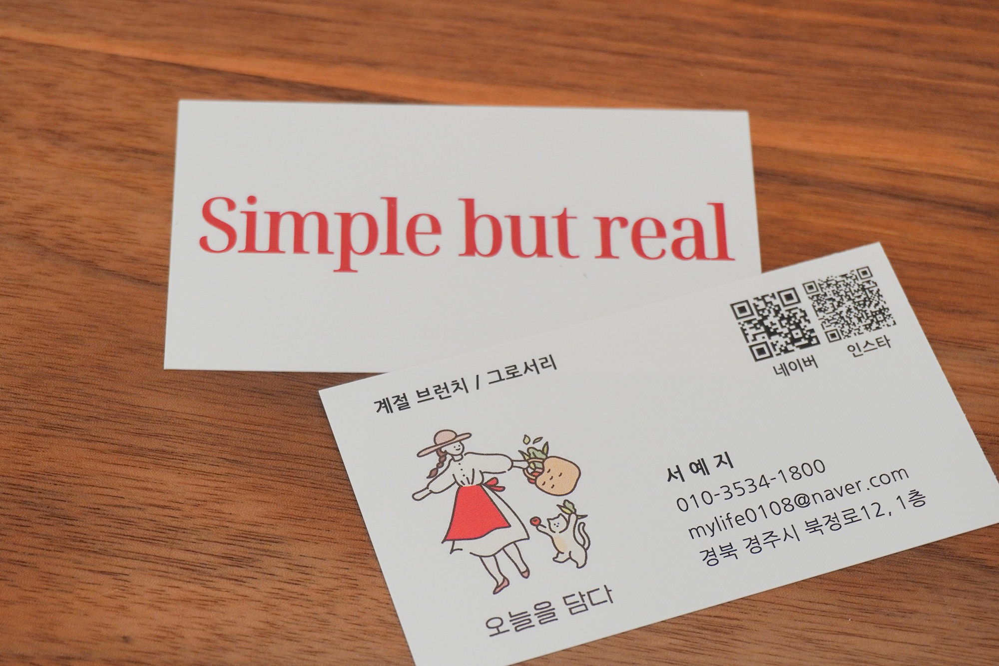예쁘다고 가지고 가고 싶다고 하시는 분들도 있어서 좀 많이 만들어 놨어요. 매장 슬로건, 왜 경주에서 매장을 하게 됐는지, 소스는 어떻게 만드는지, 인스타그램이나 네이버로 연결되는 QR 코드를 넣어놨어요.