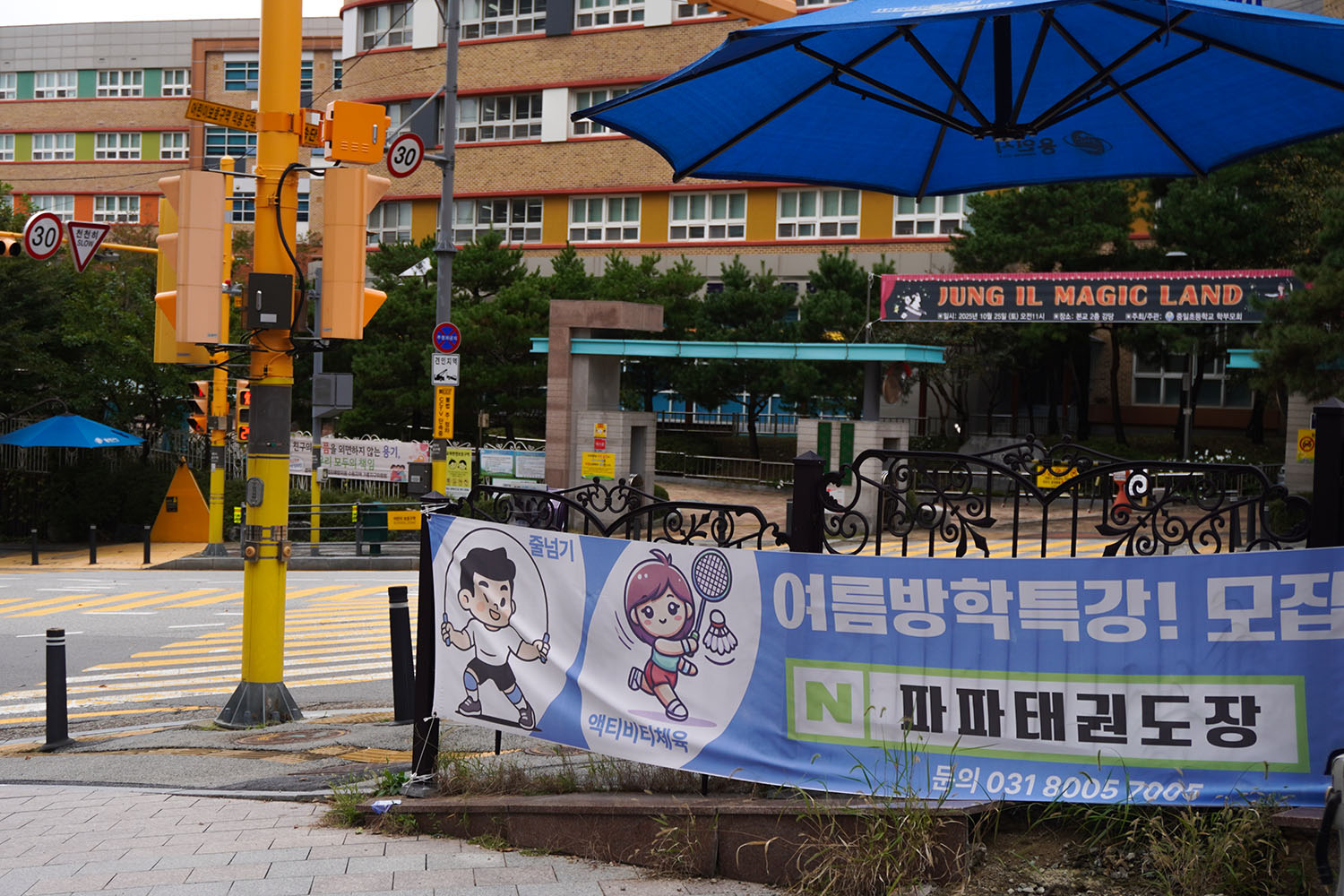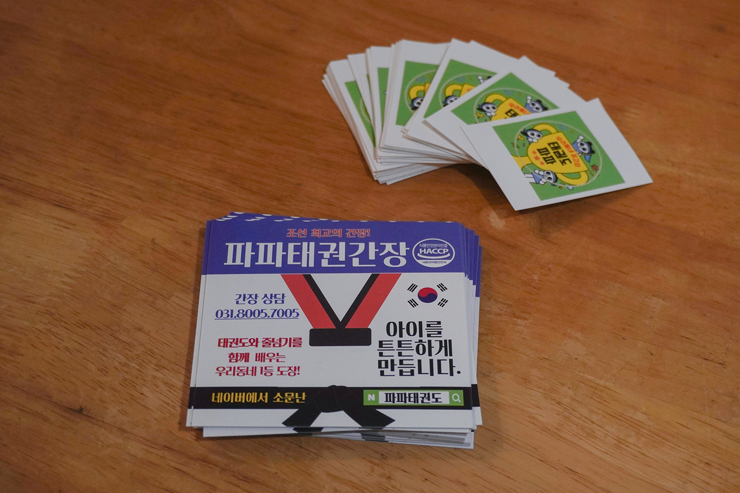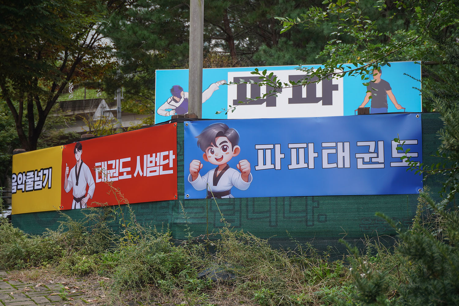 지금 저 위에 있는 파파 태권도장 현판도 제가 새로 만들었어요. 부착용 포스터인데, 저거 가격이 2-3만 원밖에 안 하더라고요.