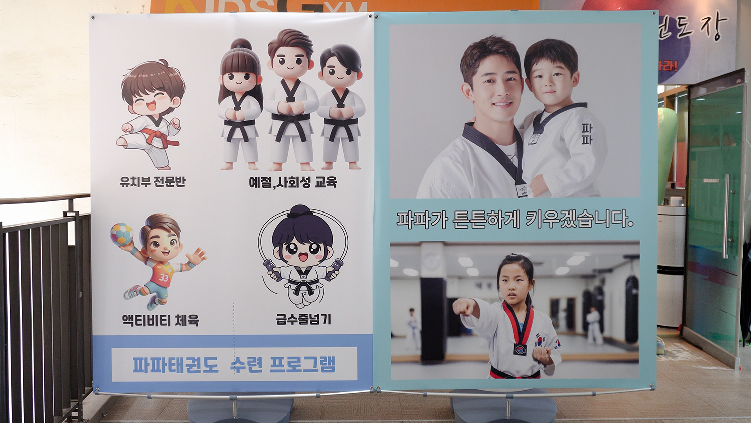 홍보 잘 하는 곳으로 소문난 매장은 어떤 모습일까요? 외관 곳곳에 있는 홍보물에서 발차기부터 떠오르는 거친 운동이 아니라 아이들이 활기차게 몸을 움직일 수 있고, 저절로 건강해지는 프로그램이 가득한 게 느껴졌습니다.