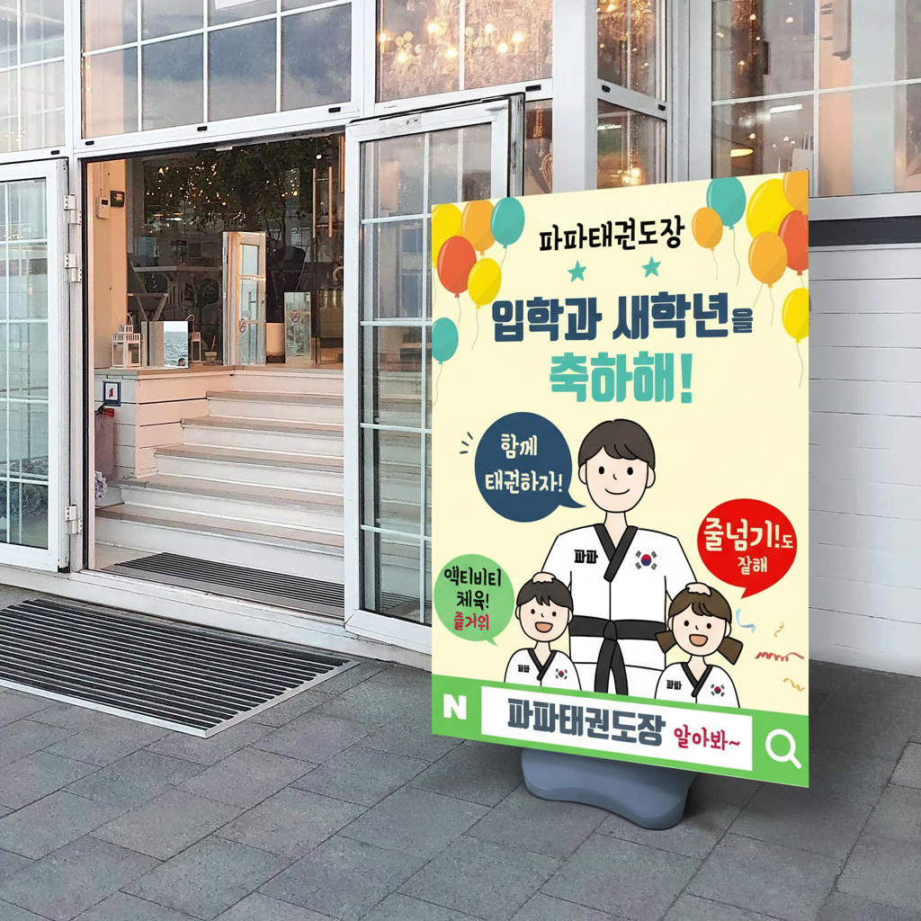 예전에는 무조건 관원모집이었어요. 하지만 이제는 아이들을 모으는 데만 집중하는 게 아니고 “태권도를 통해서 우리 아이가 이렇게 변화됐어요”처럼 저희의 교육 내용을 알리는 게 오히려 더 홍보가 될 수 있더라고요. 배너 물통과 틀만 갖춰져 있으면 그때그때 안에 배너 출력물만 바꿔주면 되기 때문에 비용도 저렴하고 잘 활용하시면 좋을 것 같아요.
