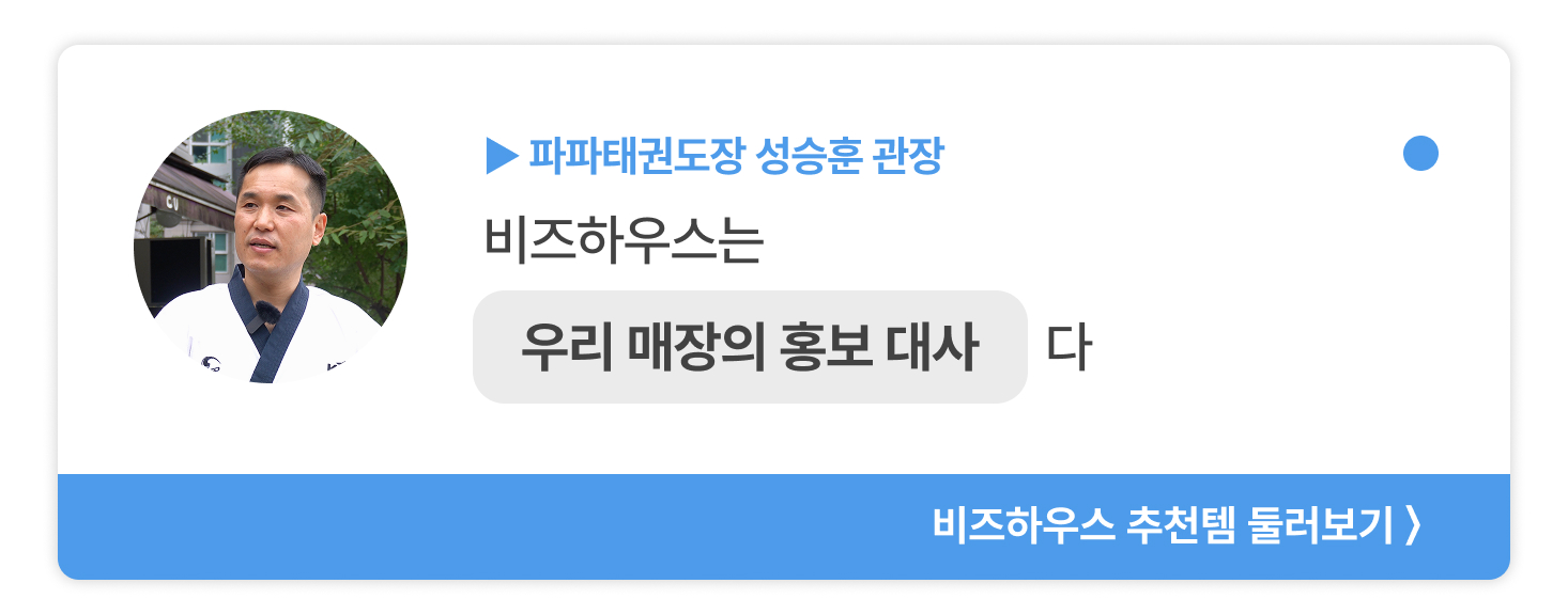 저희 같은 경우에는 유치원 어린이들이 버스를 타는 정류장이 있습니다. 거기에 배너를 갖다 놓으니까 부모님들이 ‘야, 여기 태권도장이네’ 하는데 마침 디자인이 예쁘고 색감이 좋으니까 다들 친근하게 본다는 거죠. 예전에는 태권도면 막 파괴적이고 무섭고.. 이렇게 다리를 차는 모습 위주의 사진이었잖아요. 그런데 비즈하우스에서 찾은 태권도 캐릭터나 요소들은 되게 귀엽고 재밌는 포즈를 한 아이들이 많더라고요. 또 이동 경로에 따라 위치를 바꾸니까 그게 홍보에 큰 도움이 된 것 같습니다.