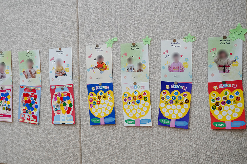 예배가 딱 끝나면 한 줄로 딱 서요. 저기 스티커가 있어요. 손등을 내밀면 제가 스티커를 붙여줘요. 아이들이 와서 자기 엽서에 붙여요. 다 붙인 아이들은 상장을 멋지게 만들어서 시상합니다.