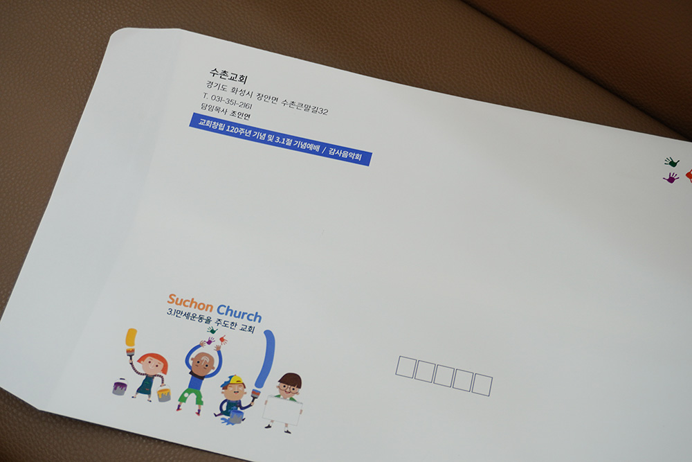 여기서 또 특별한 점은 이 광고를 꽉 차게 하지 않는다는 거예요. 작게 해도 눈에 다 들어오거든요. 또 하나는 저는 할 때 담임목사 이름을 넣지 않아요. 중요한 건 수촌 교회라는 거, 3.1 만세운동을 주도한 사실이니까 그것만 넣어서 만들었어요. 만족스러워요.