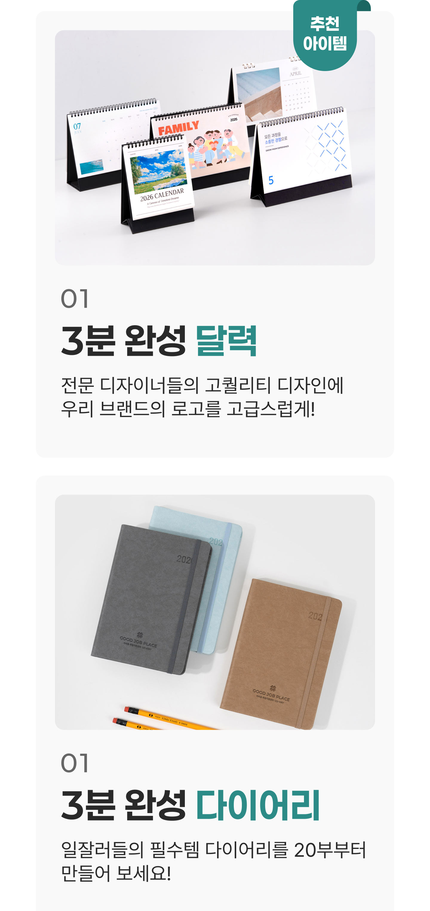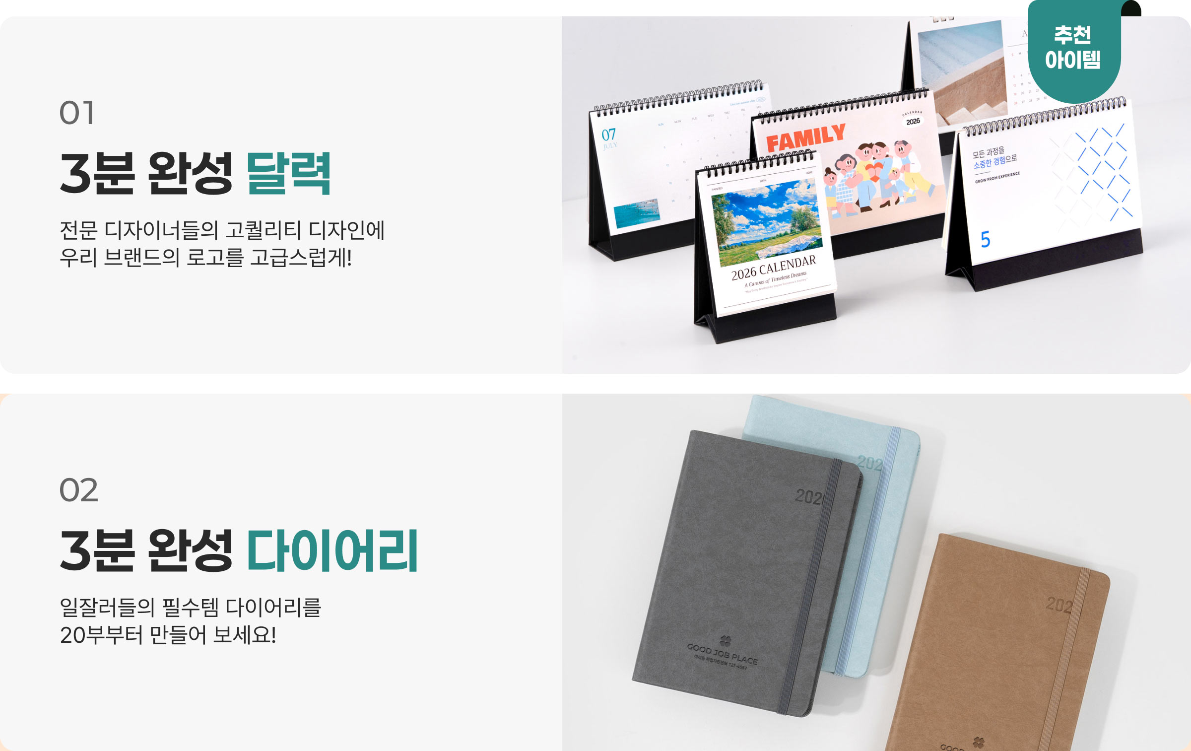 3분 완성 커스텀 달력 비장한 혜택 일잘러 다이어리 3분 완성 커스텀 달력 비장한 혜택 다이어리 깔끔한 기본 달력 1부 5,400원~ 따뜻한 일러스트 달력 1부 5,400원~ 감성 사진 달력 1부 5,400원~ 매일 성장 달력 1부 5,400원~ 친환경 양장 밴드형 25절 1부 12,990원~ 친환경 양장 밴드형 32절 1부 12,730원~ 친환경 양장 밴드형 별사이즈 1부 12,920원~ 25절 에코 스프링 다이어리 1부 13,810원~ 러블리 양장 피치핑크 1부 21,500원~ 퓨어 스프링 라이트브라운 1부 21,500원~ 퓨어 스프링 모카베이지 1부 21,500원~ 알잘딱깔센 양장 스카이블루 1부 21,500원~ 탁상 달력 200부 제작 시, 1부 5,860원 탁상 달력 박 인쇄 200부 제작 시, 1부 5,905원 듀얼 캘린더 50부 제작 시, 1부 8,800원 패브릭 달력 1장 9,900원 벽걸이 달력 ver2 1부 9,680원 윤전 달력 (3색) 100부 제작 시, 1부 1,800원대 윤전 달력 (1색) 100부 제작 시, 1부 2,400원대 벽걸이 달력 1부 13,900원~ 엽서 달력 4세트 제작 시, 1세트 6,500원대 한장 달력 1장 5,500원 친환경 양장 밴드형 25절 20부 제작 시, 1부 12,000원대 친환경 양장 밴드형 32절 20부 제작 시, 1부 12,700원대 친환경 양장 밴드형 별사이즈 20부 제작 시, 1부 12,700원대 NOCOVER DAIRY 별사이즈 20부 제작 시, 1부 12,200원대 양장 자석형 25절 20부 제작 시, 1부 18,000원대 양장 자석형 별사이즈 20부 제작 시, 1부 17,00원대 스프링 자석형 25절 20부 제작 시, 1부 18,000원대 시스템 자석형 25절 20부 제작 시, 1부 21,000원대 시스템 자석형 32절 20부 제작 시, 1부 20,000원대 비건 레더 시그니처 다이어리 20부 제작 시, 1부 16,000원대 비건 레더 베이직 다이어리 50부 제작 시, 1부 13,000원대 PP 반투명 시스템 다이어리 20부 제작 시, 1부 11,000원대 엣지형 18절 다이어리 20부 제작 시, 1부 18,000원대 엣지형 25절 다이어리 20부 제작 시, 1부 17,000원대 엣지형 32절 다이어리 20부 제작 시, 1부 16,000원대