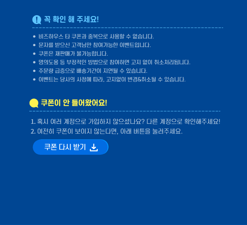 [시크릿페이지] 전상품 할인쿠폰이 발급되었습니다. 프로모션 관련 문의는 아래의 이메일로 연락주시면 더욱 원활한 응대가 가능합니다. 비즈하우스 마케팅팀 < team.bizhows.biz.mkt@miridih.com >