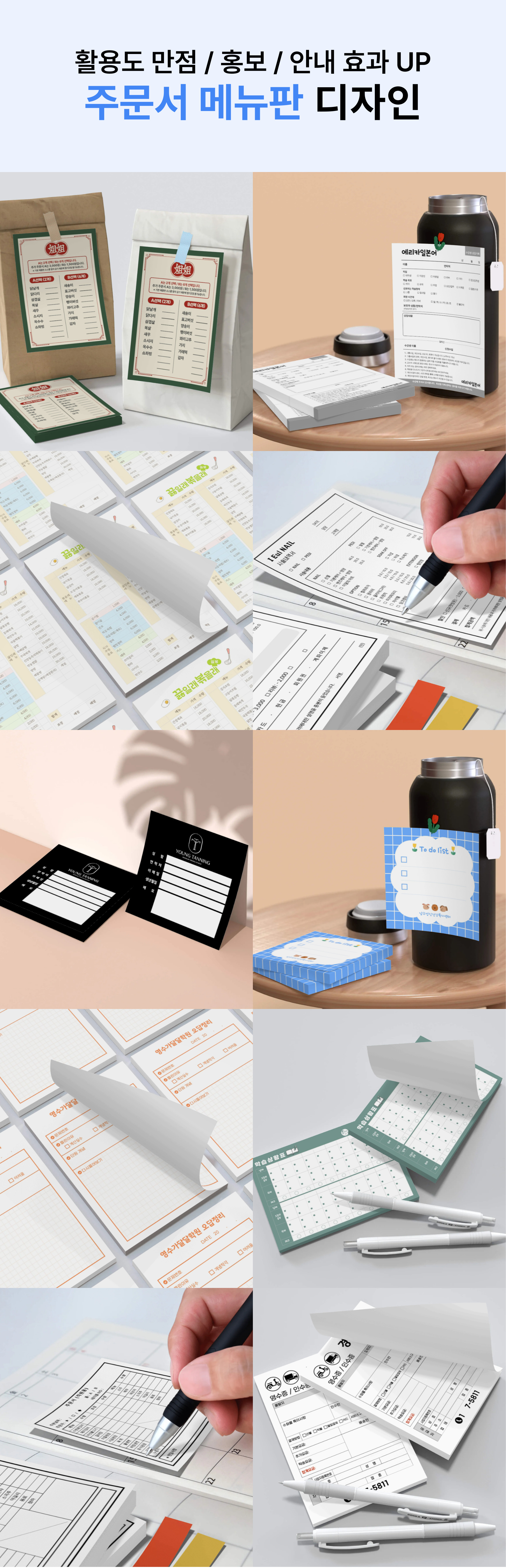 - 2단·3단 메뉴판(리플렛), 책자형 메뉴판(브로셔), 보드형 메뉴판 (실사출력 보드형), 책받침 메뉴판(양면 포스터), 주문서 메뉴판(떡메모지)