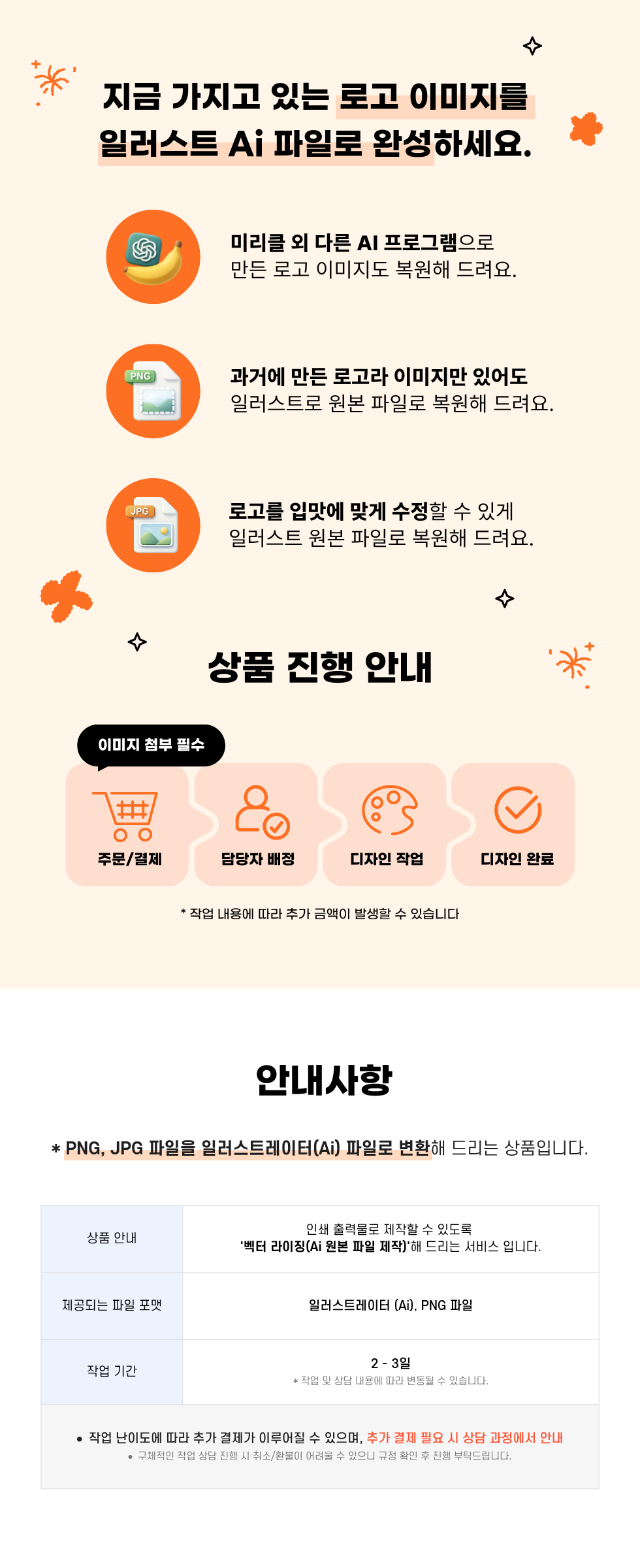 • 로고 Ai 파일 변환 서비스는 작업 난이도에 따라 추가 요금이 발생할 수 있습니다.
