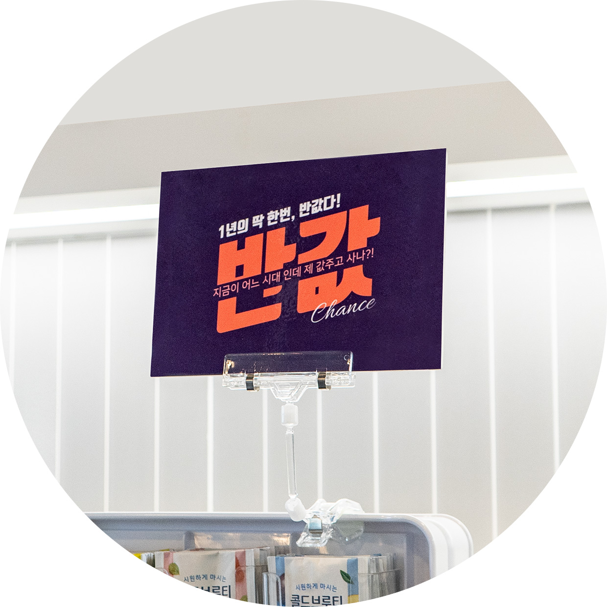 연출 이미지에 사용된 POP는 “원형 팻말-25x36cm”입니다.