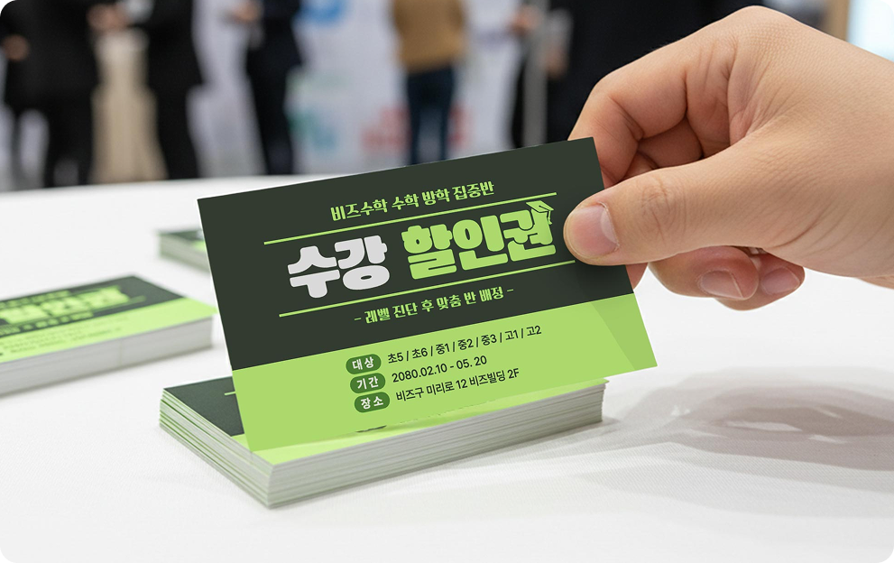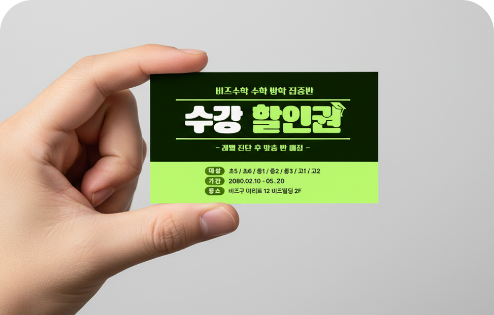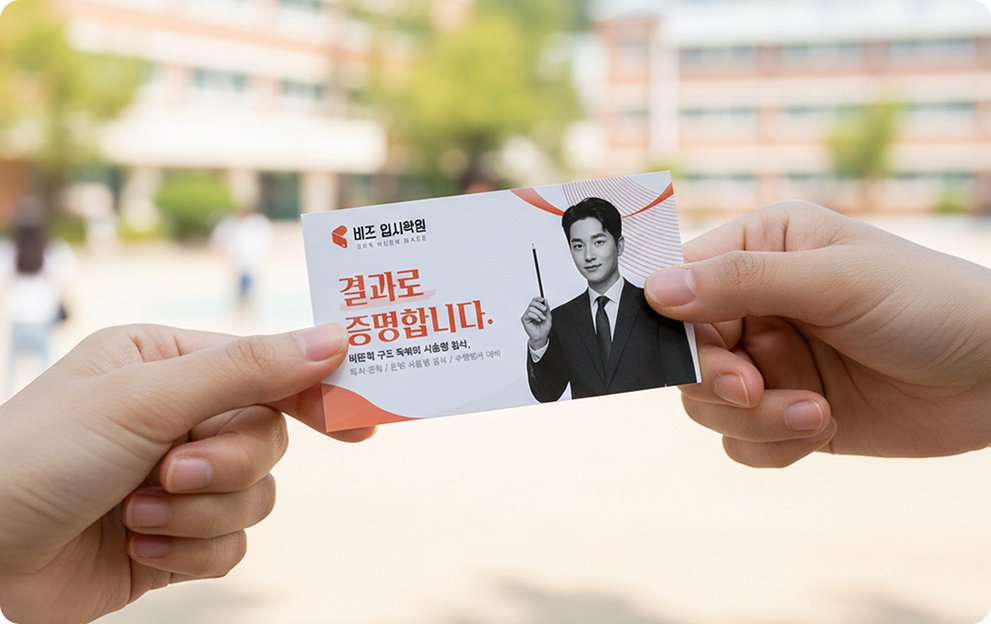 상담실에서의 열정이 현관문 앞에서 식지 않도록, 비즈하우스는 명함의 역할을 새롭게 정의했습니다. 학원 소개부터 강사 프로필, 체험권, 수강 정보까지. ‘상황별 맞춤형’ 명함을 소개합니다.