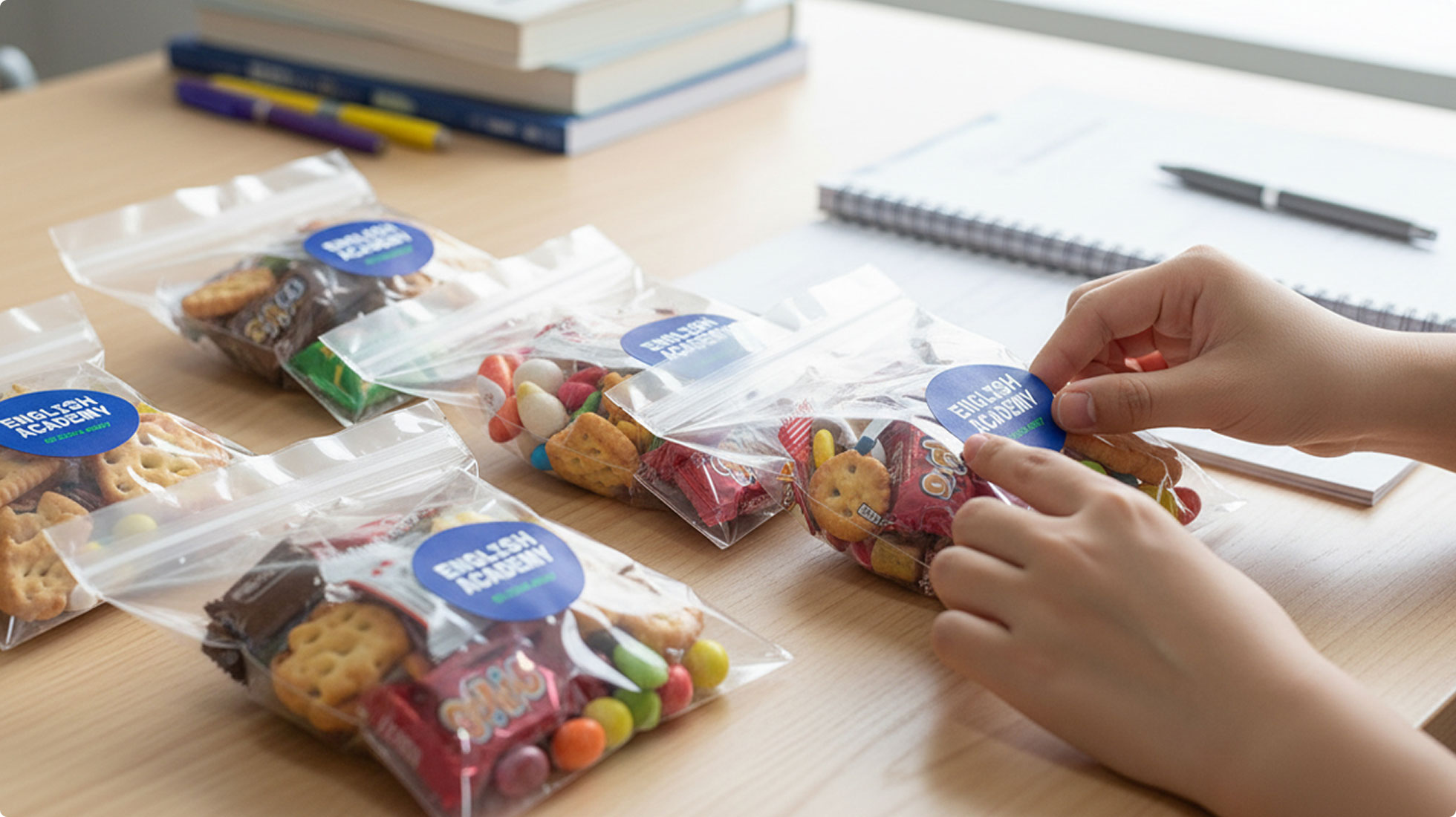 간식이나 물건에 붙여두면 학생이 사용하는 내내 학원의 이름이 반복적으로 노출됩니다.