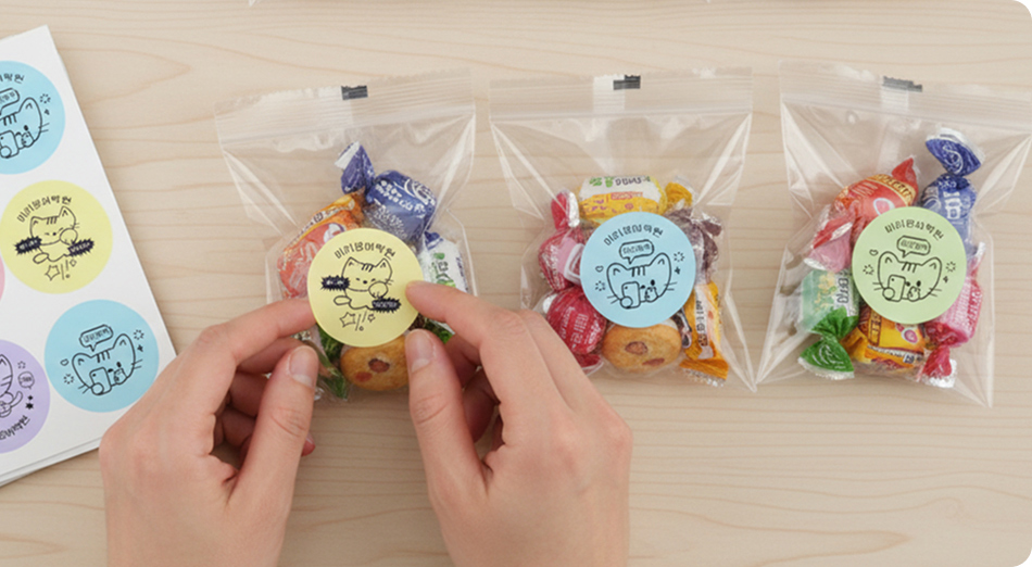 노트, 파일, 간식 봉투 어디에 붙여도 부담 없는
