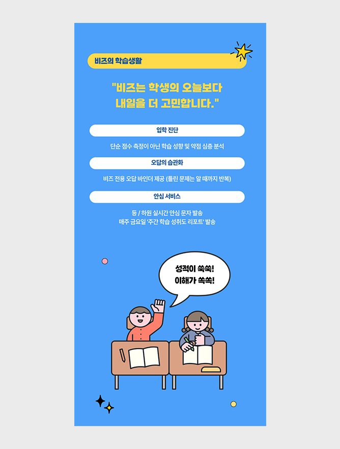 학원 현장에서 가장 효과적이었던 구조를 그대로 녹여낸 비즈하우스의 전용 템플릿을 소개합니다.
